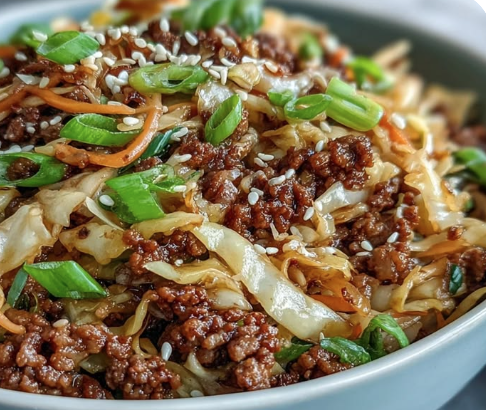 lean ground beef, sesame oil, salt, pepper, garlic, cabbage, carrots, rice wine vinegar, gluten free soy sauce, green onions, sesame seeds