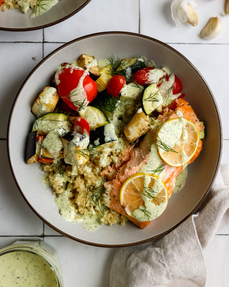 faroe salmon, quinoa, roasted tomatoes & red onions, kale, greek yogurt sauce